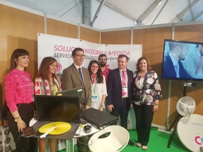 En la foto: el director general de Comunitelia, Ángel Cantón, y representantes de la empresa, durante la visita de la consejera de Economía, Patricia Franco, y al presidente de la Diputación, José Manuel Caballero, al stand en el día de la inauguración.