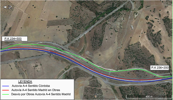 El Ministerio de Transportes, Movilidad y Agenda Urbana (Mitma) está llevando a cabo obras de rehabilitación de la estructura situada en el p.k. 235 en el término municipal de Almuradiel en Ciudad Real. La ejecución de estas obras está produciendo afecciones al tráfico. La calzada sentido Madrid de la Autovía del Sur A-4 entre los puntos kilométricos 236+200 y 234+400 se ha cortado desviándose el tráfico por la antigua N-4.
