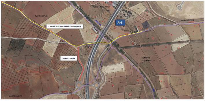El expediente contempla la cesión sin cargo del tramo de camino de servicio de la autovía A-4, margen derecha, comprendido entre los pp.kk. 202+600 y 202+930, que conecta el enlace del pp.kk. 202+950 de la autovía con el polígono industrial Entrecaminos. La longitud real del tramo a ceder es de 310 m., con una superficie estimada de 2.753,66 m2.