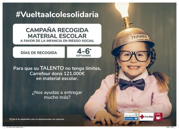 Una campaña de recogida de material escolar que arranca con la donación directa por parte de Carrefour de 121.000 euros en material escolar; aportación con la que se estima poder dar cobertura a las necesidades básicas en esta materia a miles de niñas y niños potenciales beneficiarios/as en situación de vulnerabilidad. Hablamos de la XII edición de una iniciativa que nace con el objetivo de reducir el fuerte impacto económico que supone la adquisición de material escolar para miles de personas en emergencia social de nuestro país y que se celebrará en cuatro hipermercados de la provincia Esta acción contribuye a alcanzar una educación inclusiva y de calidad en línea con el ODS (Objetivos de Desarrollo Sostenibles) 4 (Educación de Calidad) y ayudar a empoderar a estos pequeños/as en una fecha tan significativa como es el inicio del curso escolar; una campaña que, ahora más que nunca, se revela de vital importancia vista la crisis socio-económica provocada por la pandemia provocada por la COVID-19