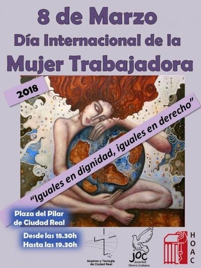 Como Iglesia encarnada en la sociedad junto a quienes sufren las injusticias, la JOC (Juventud Obrera Cristiana), la HOAC (Hermandad Obrera de Acción Católica) y Mujeres y Teología de Ciudad Real celebrarán este 8 de marzo, Día Internacional de la Mujer Trabajadora reclamando igualdad en dignidad y en derechos para todas las mujeres. Para ello, además de sumarse a las movilizaciones convocadas por las organizaciones sindicales y feministas, llevarán a cabo un acto público en la Plaza del Pilar a las 18.30 horas.