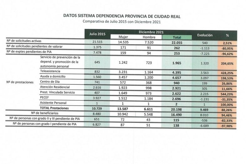 Un “record en prestaciones que también se registra en beneficiarios en la provincia de Ciudad Real” ya que, según los datos extraídos del Instituto de Mayores y Servicios Sociales, el Sistema de Dependencia de Castilla-La Mancha suma 8.010 nuevos beneficiarios, un 94,5 por ciento más desde julio de 2015, hasta alcanzar las 16.490 personas atendidas en diciembre de 2021.