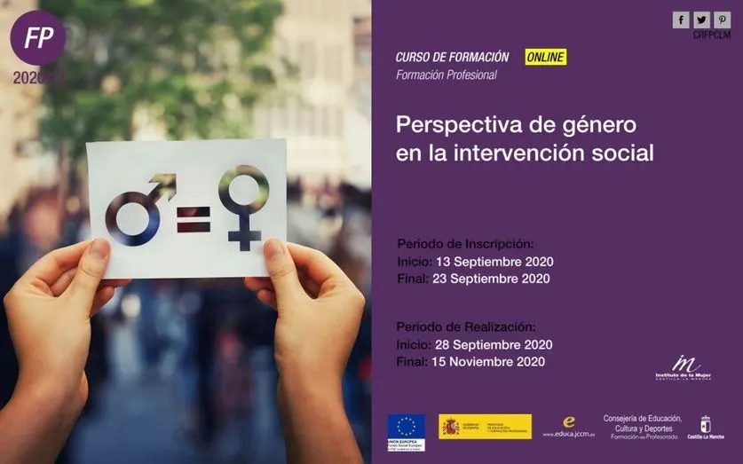 Docentes de Formación Profesional pertenecientes a centros educativos de toda Castilla- La Mancha comienzan mañana las sesiones del curso ‘Perspectiva de Género en la Intervención Social’. Esta acción formativa se impartirá on-line y es fruto de la colaboración que mantienen las delegaciones provinciales de las consejerías de Educación, Cultura y Deportes y de Igualdad a través del Instituto de la Mujer.