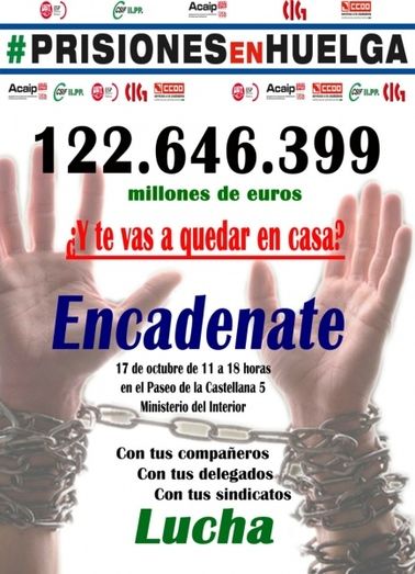 Los delegados de los sindicatos de Instituciones Penitenciarias CCOO , UGT , CSIF y Acaip de los Centros Penitenciarios de Herrera de la Mancha y Alcázar de San Juan, junto con todos los Delegados de los Centros Penitenciarios del país, se van a encadenar mañana 17 de octubre frente al Ministerio del Interior en Madrid desde la 11.00 h. hasta las 18,00 h., como medida de presión para abrir un marco de negociación, dentro de la convocatoria de Huelga prevista para los días 24 y 26 de octubre y 6,8,13,15 de noviembre en todos los Centros Penitenciarios del país.