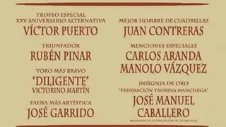 Trofeo al triunfador de la provincia de Ciudad Real, al matador de toros Rubén Pinar por su completa actuación el pasado 4 de septiembre en Daimiel con la corrida de Victorino Martín, cortando un total de cuatro orejas.
