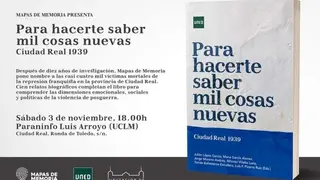 La presentación de Para hacerte saber mil cosas nuevas. Ciudad Real 1939 tendrá lugar el próximo 3 de noviembre a las 18.00h, en el Paraninfo Luis Arroyo de la UCLM (Ronda de Toledo, s/n, Ciudad Real). Mapas de Memoria invita a toda la ciudadanía a participar en un acto donde se revelarán mil cosas nuevas.