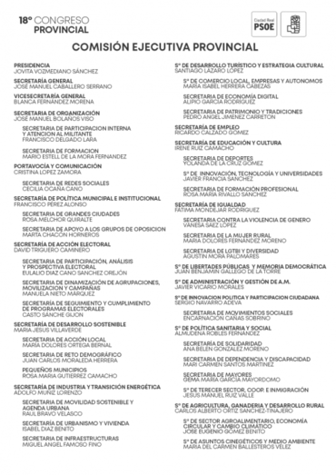 La nueva Comisión Ejecutiva tiene una edad media de 44,6 años; y ha sido renovada en un 56,25%. Entre sus componentes figuran los alcaldes de Alcázar de San Juan y Campo de Criptana, Rosa Melchor y Santiago Lázaro, respectivamente. Melchor estará al frente de la Secretaría de Grandes Ciudades, incluida en la Secretaría de Política Municipal e Institucional; y Lázaro será el secretario de Desarrollo Turístico y Estrategia Cultural. También forma parte del nuevo equipo Benjamín Gallego, concejal alcazareño, como secretario de Libertades Públicas y Memoria Democrática; así como el alcalde de Argamasilla, Pedro Ángel Jiménez, al frente de la Secretaría de Patrimonio y Tradiciones.