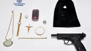 Los mismos ciudadanos que lo retenían informaron a los Agentes de Policía que, durante la persecución, éste se quitó un gorro pasamontañas que llevaba puesto en la cabeza, tirándolo debajo de un vehículo, a la vez que, el gerente del local, les hace entrega de la pistola que utilizó el arrestado para llevar a cabo el atraco fallido, arma esta que, al emprender la huida se le cayo en la puerta del establecimiento, la cual, tras la comprobación de los Agentes, se encontraba montada y lista para su disparo.