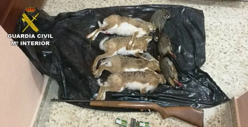 Tras identificar a esta persona y proceder al registro del vehículo, se encontraron cuatro ejemplares de liebres (Lepus arcticus), tres perdices ( Alectoris rufa) , un cargador con un cartucho en su interior que encajaba con el arma encontrada y dos cajas con 17 y 30 cartuchos respectivamente.