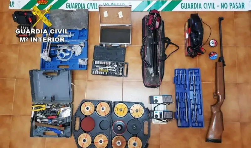 En cuanto a los efectos hallados se encuentran una carabina de aire comprimido, una caja de balines del calibre 5.5, diverso material de construcción, accesorios y útiles de pesca, walkie-talkies y material de bricolage, de los cuales en su mayor parte ya han sido entregados a su legítimo propietario.