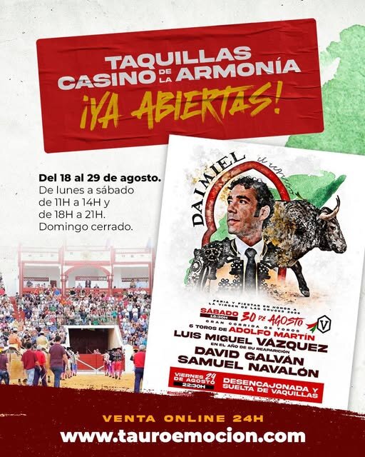 Las taquillas del Casino La Armonía permanecerán abiertas del 18 al 29 de agosto, de lunes a sábado en horario de 11h a 14h y de 18h a 21h (domingos cerrado). También se pueden adquirir entradas de forma ininterrumpida a través de la web oficial: www.tauroemocion.com.