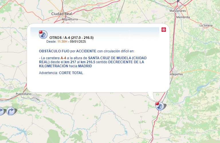 La Guardia Civil, según las mismas fuentes, está dando paso alternativo por la vía de servicio, para incorporarse en el kilómetro 216.