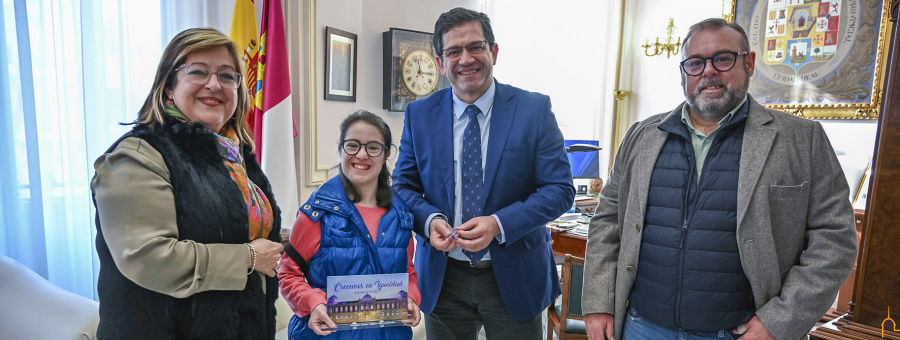Se trata de un diseño realizado por la Asociación Down Caminar, en colaboración con el Área de Igualdad, al que se le ha dado forma en su taller de metacrilato, donde trabajan una treintena de chicos y chicas. Precisamente una de ellas, Fátima de la Sierra Navarro-Fernández, ha sido la encargada de presentar el resultado final del proyecto así como los lazos conmemorativos.