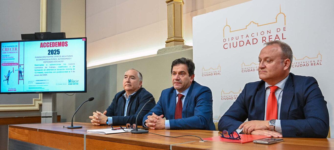 Fundación MAPFRE, la Diputación de Ciudad Real y la Federación de Empresarios de Ciudad Real, FECIR, han presentado hoy la Convocatoria de Ayudas al Empleo “Accedemos 2025”, una iniciativa puesta en marcha por la Fundación con el objetivo de fomentar el acceso al mercado laboral a través del apoyo a pymes, autónomos y entidades sociales con necesidad de contratar, pero con falta de recursos para ello. Con este programa de ayudas al empleo se pretende facilitar la contratación de los colectivos con mayores dificultades para encontrar un empleo: menores de 30 años, mayores de 50 años y otros colectivos vulnerables. Además, se busca generar también mayores oportunidades en el ámbito rural fomentando con ello el arraigo en estos territorios.