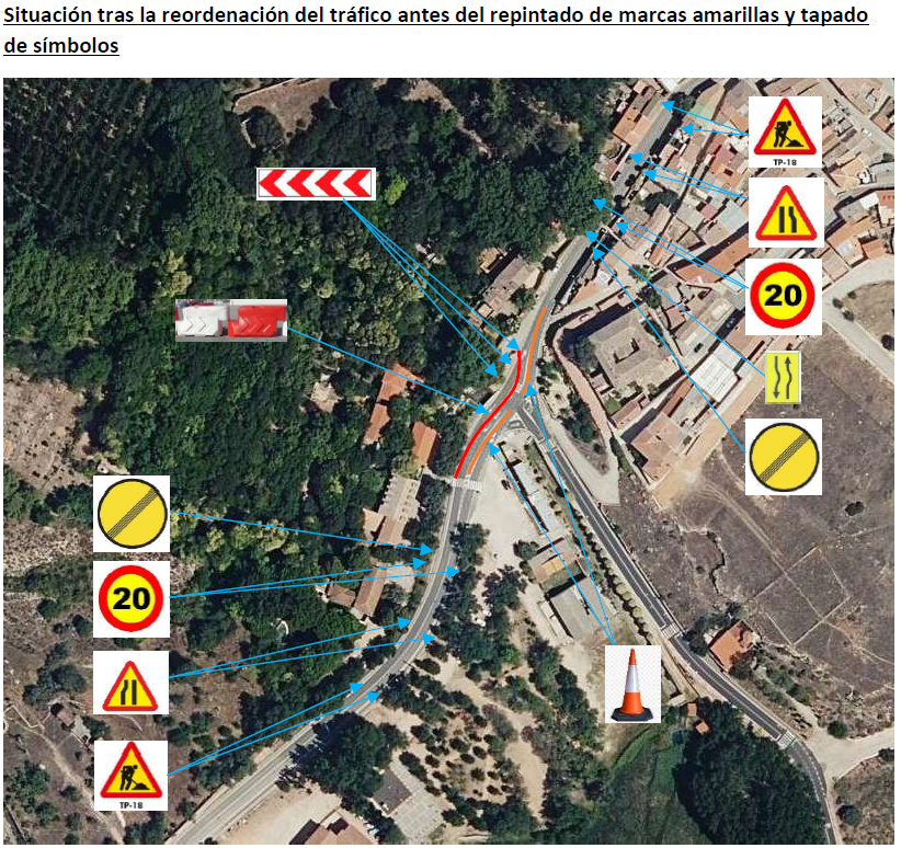 En consonancia con lo anterior se han instalado señales de obras, reforzando la limitación de velocidad (la travesía ya estaba limitada a 40 km/h), y señalización de peligro por estrechamiento. Asimismo, se reforzará el balizamiento y la señalización de obra con balizas luminosas en horario nocturno y/o condiciones de baja visibilidad.