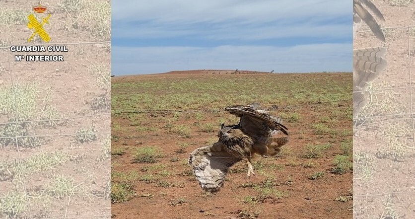 Agentes de SEPRONA de Villanueva de los Infantes recibieron un aviso comunicando que entre dos cables de espino de un vallado de la localidad se había enganchado un ejemplar de Búho Real, que se encontraba atrapado sin saber el tiempo que se llevaba en esta situación.