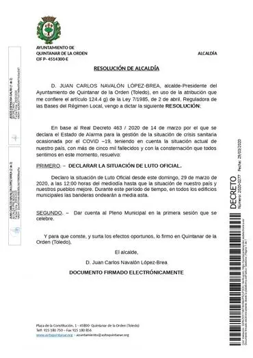 En se sentido, y teniendo en cuenta la situación actual de nuestro país, con más de cinco mil fallecidos y con la consternación que todos sentimos en este momento, ha resuelto, en primer lugar declarar la situación de luto oficial desde este domingo, 29 de marzo de 2020, a las 12:00 horas del mediodía hasta que la situación de nuestro país y nuestros pueblos mejore. Durante este período de tiempo, en todos los edificios municipales las banderas ondearán a media asta.