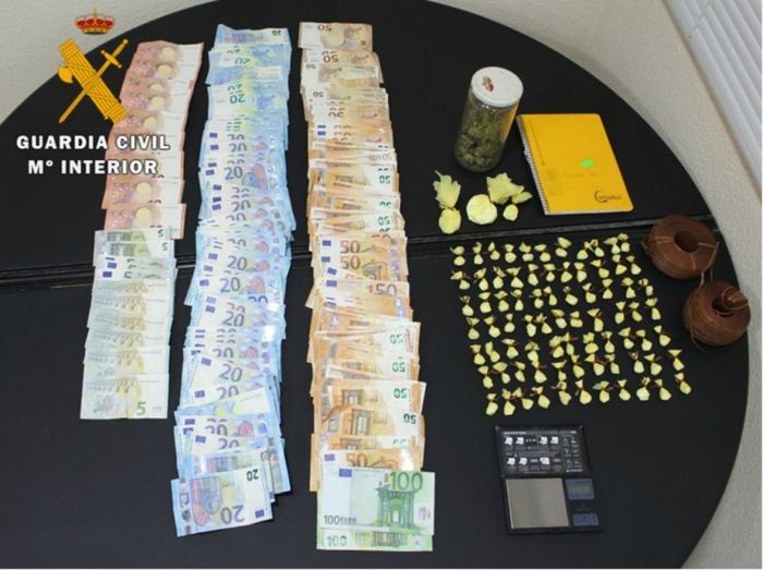 Una vez analizada toda la información, la Guardia Civil solicitó a la Autoridad Judicial correspondiente una autorización de entrada y registro para esta vivienda, donde los agentes hallaron en distintas estancias de esta propiedad y con la participación del Servicio Cinológico con su perro detector de drogas, 82,20 gramos de cocaína repartidas en listas para la venta y 24,11 gramos de marihuana, además de 2 básculas de precisión y otros elementos para su dosificación, 6.860 €, dispositivos móviles y documentación relacionada con la venta de estas sustancias.