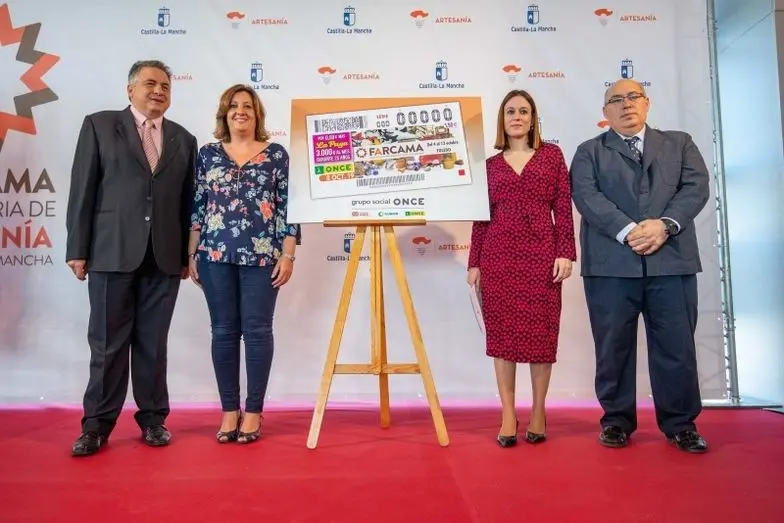 La imagen de la Feria de Artesanía de Castilla-La Mancha llegará a todos los rincones de España desde este jueves, 3 de octubre, fecha en la que se pondrán a la venta 5,5 millones de cupones de la ONCE elaborados de manera especial para la ocasión. El director territorial de la ONCE en Castilla-La Mancha, Carlos Javier Hernández, ha hecho entrega a la consejera de Economía, Empresas y Empleo, Patricia Franco, de una réplica del cupón que se pondrá a la venta el día antes de la inauguración de FARCAMA.