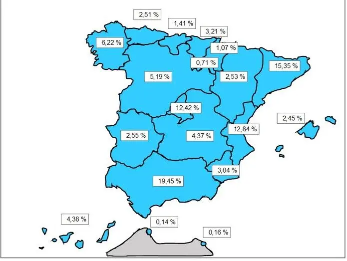 En Castilla-La Mancha las solicitudes registradas suponen un 4,37% del total tramitadas en España. Las comunidades autónomas donde se han registrado más solicitudes son Andalucía, con 19,45% del total; Cataluña (15,35%), la Comunidad Valenciana (12,85%) y Madrid (12,42%). En términos absolutos, en Andalucía se han tramitado 192.154 solicitudes; en Cataluña, 151.633; y en la Comunidad Valenciana, 126.879. En los datos desagregados por CCAA hay un desajuste temporal respecto a las cifras totales, por eso la suma total es más baja.