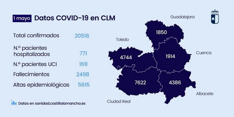 Por provincias, Ciudad Real acumula 7.622 casos, Toledo 4.744, Albacete 4.386, Cuenca 1.914 y Guadalajara 1.850. El número de hospitalizados continúa descendiendo hasta un total de 771. Por provincias, Ciudad Real tiene 281 hospitalizados, Toledo 227, Albacete 175, Guadalajara 79 y Cuenca 29.