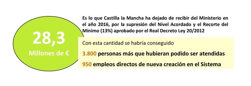 Parreño recuerda, en nombre de la asociación, que Castilla-La Mancha dejó de recibir del Estado, en el año 2016, 28,3 millones de euros, como consecuencia de la supresión del Nivel Acordado y la reducción de un13% del Nivel Mínimo de financiación estatal, aprobado en julio de 2012 (R.D. Ley 20/2012). Cantidad con la que, según la asociación, se hubiera podido atender a 3.800 personas más y se hubiera generado no menos de 950 nuevos empleos directos.