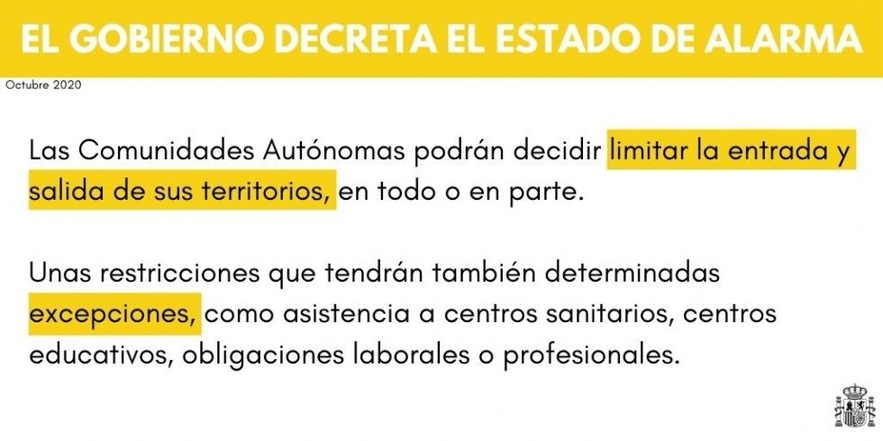 Esta restricción de entrada y salida de personas tendrá excepciones como la asistencia a centros sanitarios, centros educativos, cumplimiento de obligaciones profesionales o laborales, etc.