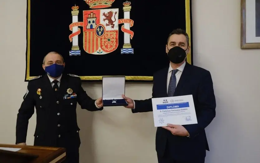 El delegado del Gobierno de España en Castilla-La Mancha, Francisco Tierraseca, ha recibido esta mañana la Medalla de Reconocimiento de Servicio en la Pandemia COVID-19, creada por la Unión Nacional de Jefes y Directivos de Policía Local (UNIJEPOL) de acuerdo con la Federación de Municipios y Provincias de España (FEMP).