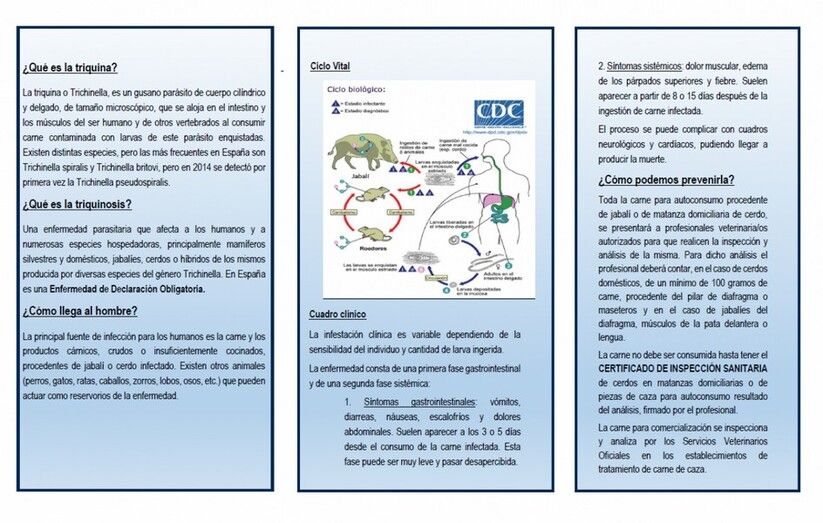 En este tríptico, que busca principalmente informar a las personas que realizan matanzas domiciliarias y caza para autoconsumo, se destaca que la salazón, el ahumado y la desecación no son eficaces para la eliminación del parásito.
