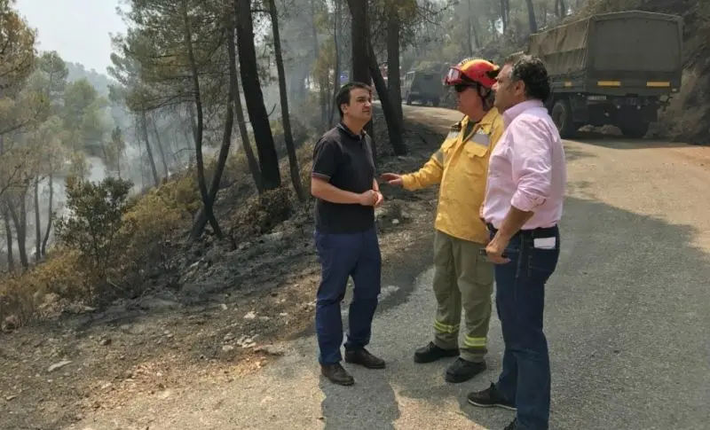 Francisco Martínez Arroyo, tras presidir el Comité Asesor Regional del Plan INFOCAM de lucha contra incendios forestales desde el Puesto de Mando Avanzado instalado en Yeste, se ha trasladado a los diferentes puntos en los que se encuentran alojados los vecinos de las diez pedanías y el camping que han tenido que ser desalojados, ubicados en instalaciones de Yeste, Molinicos. También se ha acercado hasta aquellos puntos en los que están trabajando los profesionales de retenes del SEPEI de la provincia de Albacete, cuerpo de agentes medioambientales, personal de la empresa pública Geacam, de la UME, Protección Civil o Cruz Roja y el propio personal municipal, agradeciéndoles la labor que están realizado. “Están ayudándonos a todos a luchar contra este incendio” ha destacado, alabando el trabajo de los profesionales de extinción que luchan contra el fuego.