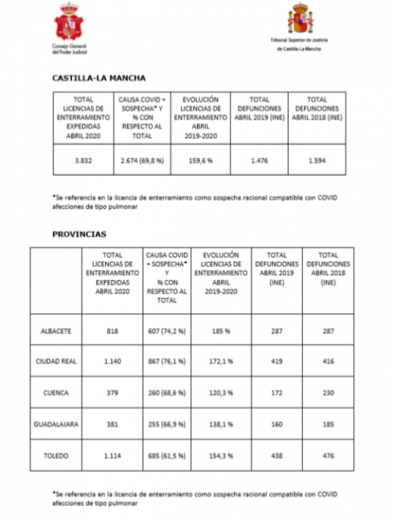 Las defunciones en Castilla-La Mancha en abril de 2020 se han incrementado un 159,6 % con respecto a las inscritas en el mismo periodo del año anterior. Los registros civiles de Castilla-La Mancha han expedido el pasado mes de abril 3.832 licencias de enterramiento cuando en el mismo mes de 2019 se registraron 1.476 defunciones.