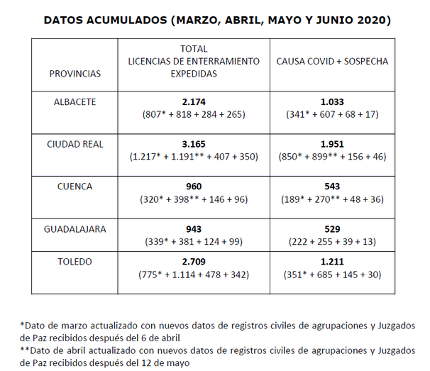En ese sentido, y siguiendo el Protocolo aprobado al efecto, médicos forenses de los Institutos de Medicina Legal de Albacete, Cuenca y Guadalajara, y de Ciudad Real y Toledo, están colaborando con los Registros Civiles en la revisión de las licencias de enterramiento y defunciones ya inscritas desde el día 1 de marzo de 2020, a los efectos de que pueda quedar constatada la causa inicial o fundamental del fallecimiento en aquellos casos en los que aparezcan sospechas o factores racionales de probabilidad de COVID 19, y se están visando todas las