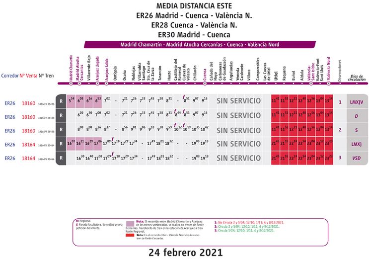 Con fecha de ayer, 24 de febrero, Renfe ha actualizado sus horarios en dicho corredor, indicando "sin servicio" en dicho tramo, en el que tampoco van a dar transporte alternativo por carretera entre Cuenca y Utiel, por lo que las localidades de Cañada del Hoyo, Carboneras de Guadazaón, Arguisuelas, Yemeda-Cardenete, Víllora, Camporrobles y Las Cuevas de Utiel, éstas dos últimas de Valencia, han dejado de tener parada de tren (ver el documento pdf adjunto).