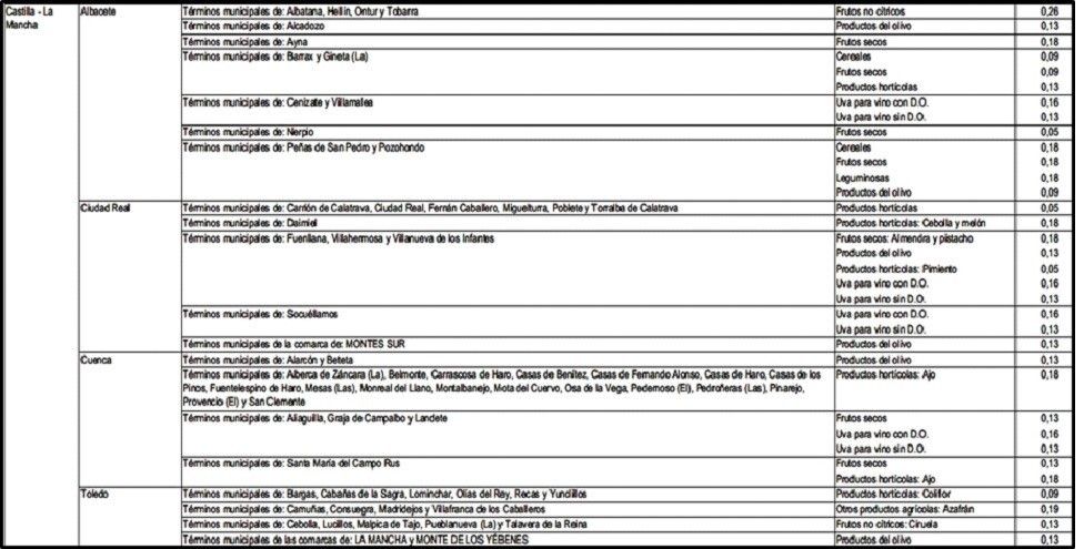 De esta forma la rebaja en la tributación beneficiará a 56 municipios de Toledo, a 24 de Cuenca, a 19 de Ciudad Real y a 13 de Albacete, aplicándose la reducción de los índices de rendimiento neto fundamentalmente a productos del olivar y hortícolas, uva de vinificación, frutos secos, frutos no cítricos, cereales y leguminosas, además de a productores de ganado ovino y caprino de carne, porcino ibérico y vacuno de carne, además de apicultores.