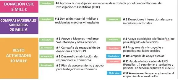 También ha destinado una partida de 10 millones de euros para impulsar acciones en España, dirigidas a atender psicológicamente a los ciudadanos que hayan perdido a un familiar; acompañar a los mayores que se encuentren solos a través del voluntariado; asistir a las personas de la tercera edad con menos recursos mediante microdonaciones; desarrollar y fabricar respiradores automáticos y equipos de protección individual; proporcionar bienes de primera necesidad; y recuperar el empleo a través de ayudas, dirigidas principalmente a pymes y autónomos.