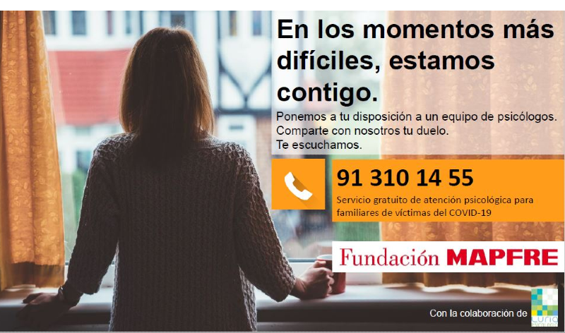 Ayudar a las personas que han perdido a algún familiar o ser querido con motivo de Covid-19 es el objetivo de una línea telefónica y online gratuita, que han puesto en marcha Fundación MAPFRE, en colaboración con el Grupo Luria Psicología y la Asociación Nacional de Servicios Funerarios (PANASEF).