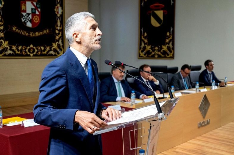 Grande-Marlaska ha presidido el acto de entrega de diplomas a los miembros de la XLVIII promoción del Cuerpo de Ayudantes de Instituciones Penitenciarias, celebrado en el Paraninfo de la Universidad de Castilla-La Mancha en la capital conquense y al que han asistido, entre otras autoridades, el secretario general de Instituciones Penitenciarias, Ángel Luis Ortiz, y el alcalde de la ciudad, Darío Dolz.
