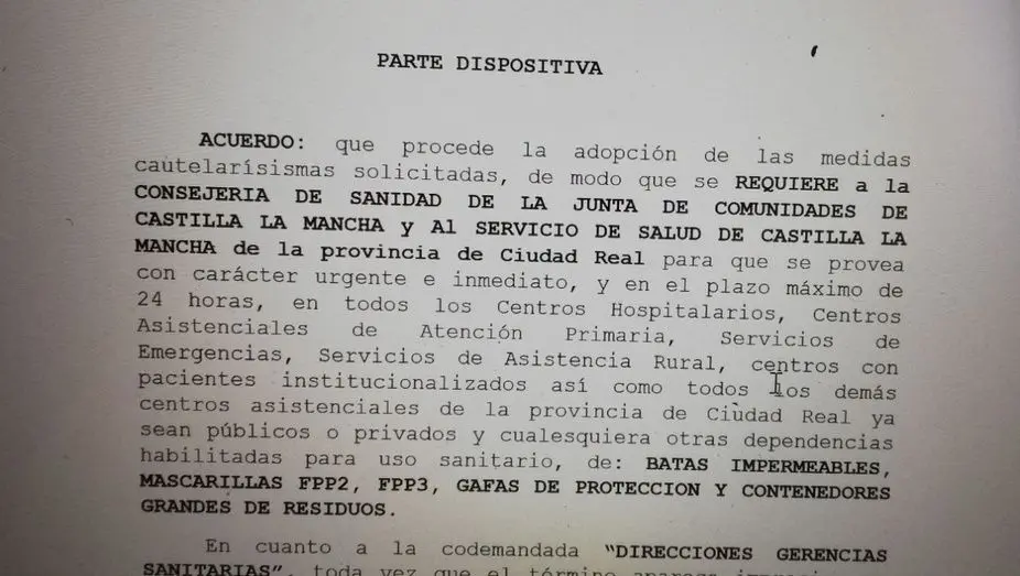 Dos Juzgados de lo Social de Ciudad Real y Toledo han requerido este viernes a la Consejería de Sanidad de la Junta de Comunidades de Castilla-La Mancha, al Servicio de Salud de Castilla-La Mancha (SESCAM) y a las Gerencias sanitarias de Ciudad Real y Toledo, para que se provea con carácter urgente e inmediato, y en un plazo de 24 horas, de equipos y elementos de protección individual frente al Covid-19 a los centros sanitarios de ambas provincias.