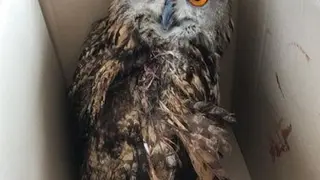 Este ejemplar de Búho Real presentada heridas sangrantes en una ala y una pata producidas, al parecer, tras impactar con el vallado de una explotación agrícola próxima, recuperándose a día de hoy de estas heridas.