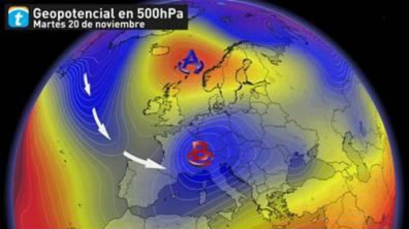 El potente anticiclón situado al norte de Europa permanecerá estancado en esa zona creando lo que se llama anticiclón de bloqueo. El anticiclón ejerce de “escudo” ante la llegada de borrascas que no tienen más opción que desviar su camino y en este caso lo harán hacia España.