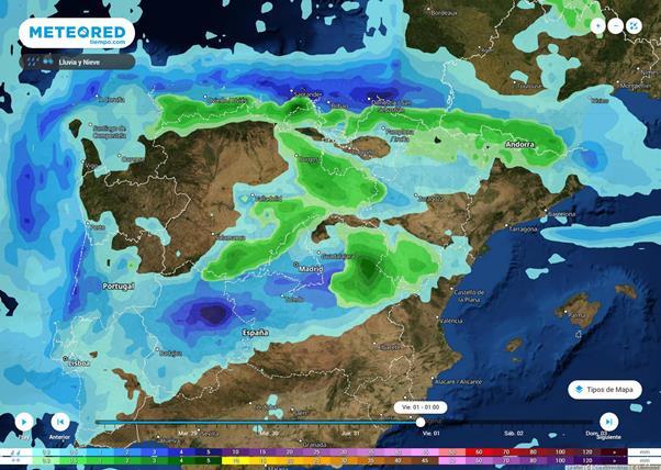 Las nevadas serán las protagonistas en la zona de Pirineos y la Cordillera Cantábrica -pueden llegar hasta el metro de espesor-, en cotas situadas entre los 500 y 1000 metros. Se espera que nieve también durante los primeros días de la semana en el Sistema Ibérico, Sistema Central y en las Béticas.