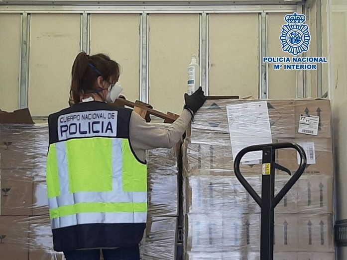 Por todo ello se procedió a la intervención de 19.600 mascarillas, 12.886 soluciones hidroalcohólicas, 1.280 gafas protectoras, 468 botellas de alcohol, 498.700 guantes de nitrilo y 150 batas de protección desechables.