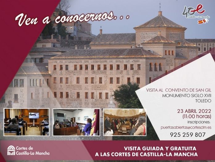 Las personas interesadas en tomar parte de esta actividad gratuita pueden dirigir un correo electrónico a puertasabiertas@cortesclm.es o telefonear el número 925 259 807. Quienes participen en esta visita guiada recorrerán diferentes espacios del parlamento, ubicado en un antiguo convento del siglo XVII, desde el Salón de Plenos hasta las salas de la Mesa, de comisiones o institucional de Prensa, la Biblioteca o unas magníficas vistas al río Tajo desde la terraza del edificio de grupos. Además, podrán conocer mejor el desarrollo de la actividad de los 33 diputados y diputadas y admirar un ejemplar de edición limitada de la Constitución Española.
