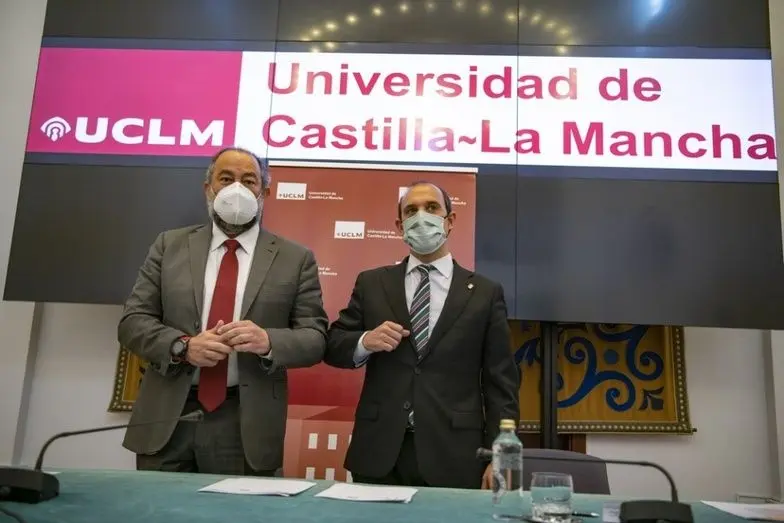 El presidente de las Cortes de Castilla-La Mancha, Pablo Bellido, y el rector de la Universidad de Castilla-La Mancha (UCLM), Julián Garde, han firmado esta mañana en el campus de Ciudad Real dos convenios de colaboración, con una vigencia de cuatro años, con los que mantienen una relación entre instituciones que se remonta a 1996 y que se amplía ahora con nuevas colaboraciones en materias como sostenibilidad, igualdad y despoblación y en la celebración de los 40 años de Estatuto de Autonomía de Castilla-La Mancha.