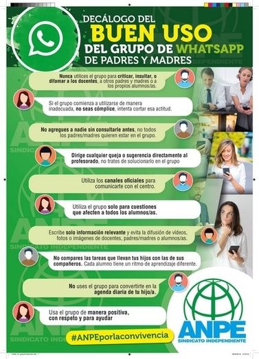 Para ANPE los grupos de WhatsApp de padres y madres pueden ser muy útiles para intercambiar información sobre actividades escolares y extraescolares del centro, pero nunca deben utilizarse para criticar, insultar o difamar a los docentes, a otros padres y madres o a los propios alumnos/as.