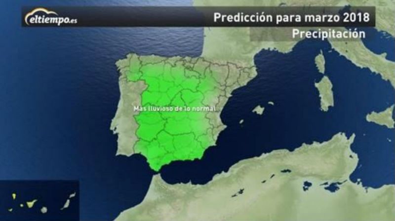 La buena noticia viene de la mano de las precipitaciones y es que marzo podría traer más lluvia de lo normal en toda la mitad sur, oeste y centro de España, manteniéndose dentro de la media el Mediterráneo, Cantábrico y Baleares. En las islas más occidentales de Canarias las precipitaciones podrían estar por debajo de la media.