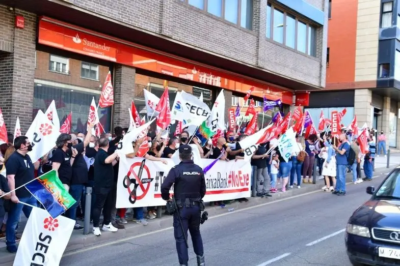 Más de medio millar de personas, trabajadoras y trabajadores de Caixabank en Castilla-La Mancha, se concentraron ayer en Toledo, ante la sede de la delegación territorial de la entidad, contra el ERE que pretende ejecutar la dirección y que en nuestra región afecta a más del 21% de la plantilla.