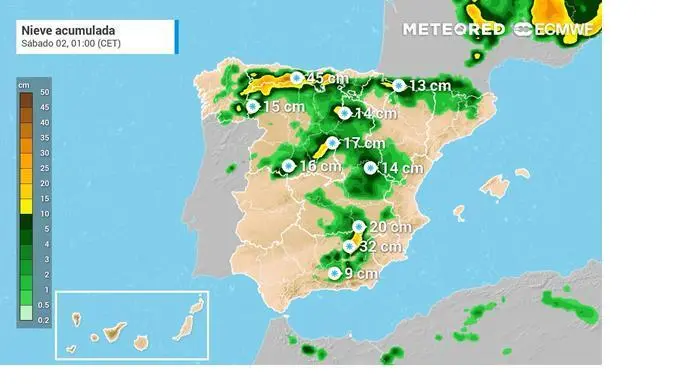 La cota de nieve se desplomará y nevará en sitios poco habituales. Podrá nevar tan solo a partir de los 400 metros en Pirineos y la zona cantábrica, de los 600 metros en la zona centro y de los 700 u 800 metros en el resto de la Península y Baleares. Incluso podrían verse algunos copos en la ciudad de Madrid.