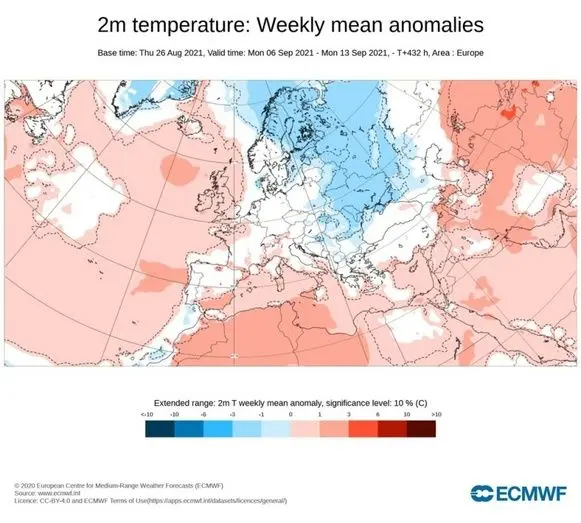 En la primera semana de septiembre se espera que las altas presiones se sitúen sobre las Islas Británicas, predominando los vientos de levante y atrayendo inestabilidad en altura, que llegará desde el Atlántico. Esto hará que las temperaturas presenten registros de hasta 1 ºC por debajo de lo habitual en las islas occidentales del archipiélago canario, oeste de Extremadura y golfo de Cádiz. Frente a esto, en el sureste peninsular, la Cordillera Cantábrica, los valles del Esla y Pisuerga y en el interior norte de Galicia, las temperaturas superarán en 1 y hasta 3 ºC los valores habituales.