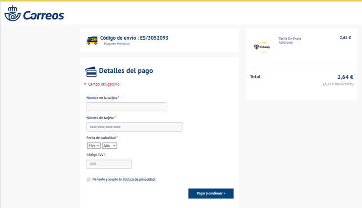 En este otro ejemplo que mostramos, también suplantan el diseño de la web legítima de Correos para no levantar las sospechas del usuario. Si este pulsa sobre el botón ‘RECIBIR’, le aparecerá por pantalla un formulario para que introduzca sus datos bancarios (Nombre del titular de la tarjeta, número de la tarjeta, etc.).